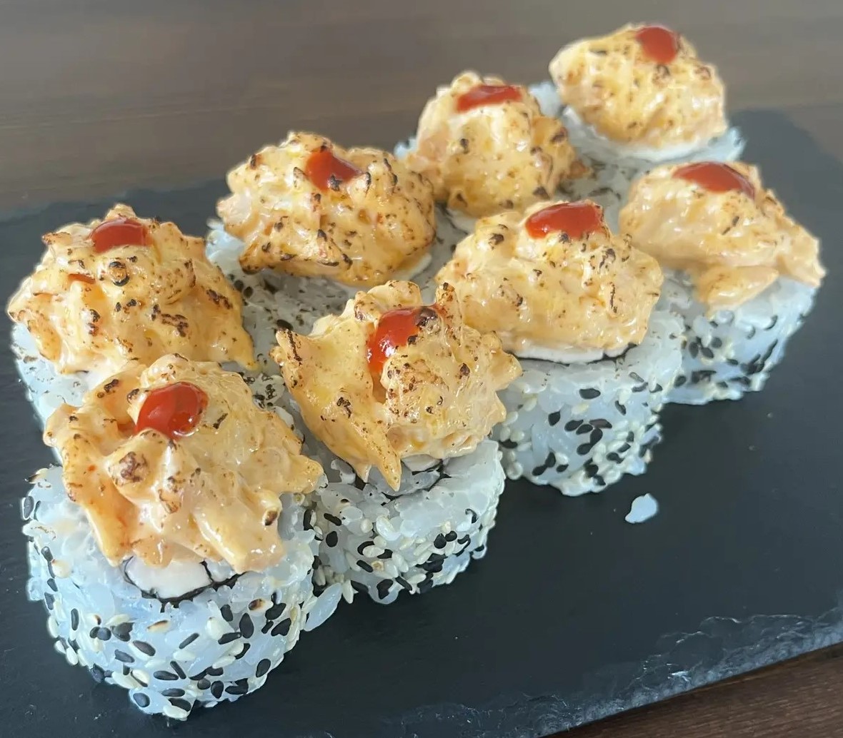 Рис, Нори, сливочный сыр, замес спайси гриль лосось, Шри рача, кунжут черный и белый. 8 штук
